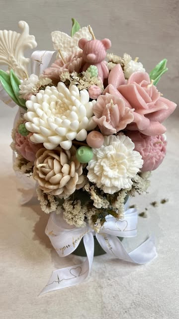 هدیهای خاص و دخترونه مناسب كادو و جشن تكليف و هديه و گيفت سایز باکس: حدود ۲۴ سانت گرد از جنس چرم باکس شمع گل – تم سفید و صورتی حدود ٢٤ سانت با بگ مقوايي سفيد جلو طلقي دسته دار